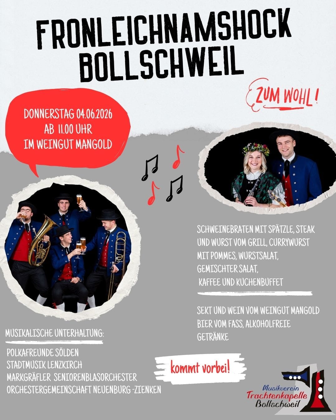 Der Musikverein Trachtenkapelle Bollschweil e. V., gegründet im Jahr 1863, ist ein traditionsreicher Verein mit heute 230 passiven, 69 aktiven und 79 Ehrenmitgliedern. Alle vereint die Freude an der Musik. Die aktiven Mitglieder musizieren in fünf verschiedenen Orchestern und Gruppen. Als Mitglied des Markgräfler Musikverbands wird der Verein derzeit von einem sechsköpfigen Vorstandsteam geleitet.